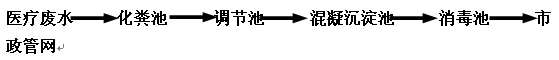 污水由排水系統(tǒng)收集后,進(jìn)入污水處理站的化糞池,厭氧分解其中的糞便及大分子有機(jī)物,然后進(jìn)入調(diào)節(jié)池,進(jìn)行均質(zhì)均量,調(diào)節(jié)池中設(shè)置液位控制器,再經(jīng)液位控制儀傳遞信號(hào),由提升泵送至混凝沉淀池,加藥絮凝沉淀之后,流入消毒池進(jìn)行消毒處理,消毒出水直接排入市政管網(wǎng)。