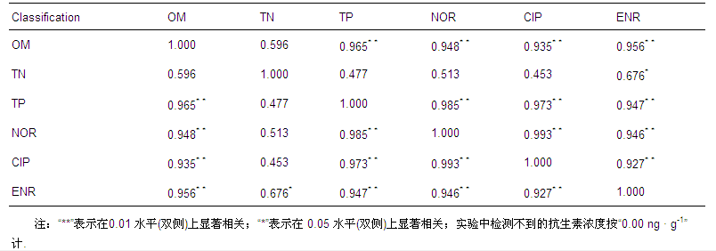 本研究中(表 1和表 2),3種FQs與OM、TP間呈極顯著正相關(guān).S9點(diǎn)位OM含量最高,沉積物中的OM蘊(yùn)含物質(zhì)復(fù)雜多元,F(xiàn)Qs進(jìn)入水體后會迅速被吸附,因此S9點(diǎn)位測得的3種FQs也最高,這與張勁強(qiáng)等的研究也相符合.Carrasquillo認(rèn)為FQs有很強(qiáng)烈的吸附固相,能夠強(qiáng)烈吸附在顆粒物和沉積物中(Carrasquillo et al., 2008),可見FQs與沉積物間的相互吸附作用強(qiáng)烈,也可以解釋FQs在沉積物中含量高的原因.