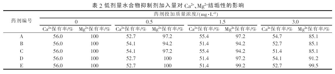 為驗證低劑量水合物抑制劑對油田污水結垢性的影響,按表1 配制強結垢型的油田污水,并添加質量分數(shù)為0.5%~3%低劑量水合物抑制劑進行試驗,結果見表2?試驗表明,對于具有較強結垢趨勢的油田水質,加入水合物抑制劑后,Ca2+的保有率比空白稍有下降,但不顯著,即水合物抑制劑的加入對油田污水碳酸鈣垢的沉積不會造成太大的影響?除了E外, 隨著A~D 水合物抑制劑用量增加,Mg2+的保有率有不同程度的下降, 表現(xiàn)出對油田污水中Mg2+的沉積有一定的促進作用?