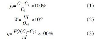 COD:Hach試劑法;氨氮:Hach試劑法;堿度:鹽酸滴定法;硬度:EDTA滴定法;氯離子:硝酸銀滴定法;電導(dǎo)率:電導(dǎo)率儀測量;濁度:濁度計(jì)測量;pH:pH計(jì)測量;另外需要記錄的裝置運(yùn)行參數(shù)包括流量、壓強(qiáng)、運(yùn)行電壓、電流等。脫鹽率、耗電量、電流效率分別按照式(1)~式(3)計(jì)算。