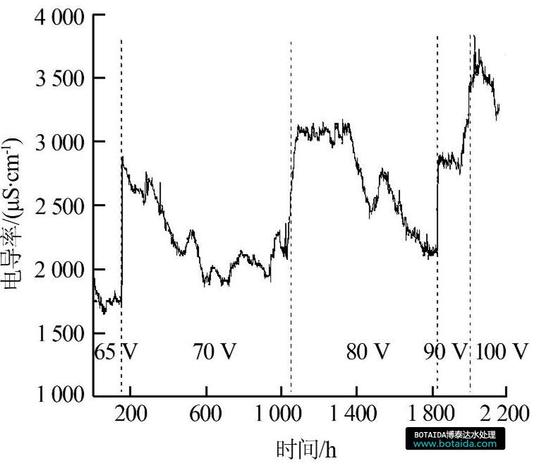 運(yùn)行電壓隨進(jìn)水電導(dǎo)率變化趨勢見圖3。