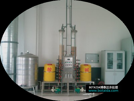混床是指水依次通過裝有氫型陽離子交換樹脂的陽床和裝有氫氧型陰子交換樹脂的陰床的系統(tǒng)。氫型陽交換床用于除去水中的陽離子;氫氧型陰交換床用于除去水中的陰離子。通過復床可將水中的種礦物鹽基本除去。為了獲取較好的除鹽效果,陽床內(nèi)裝載強酸陽離子交換樹脂,陰床一般內(nèi)裝載強堿陰離子交換樹脂?;齑惨卜譃轶w內(nèi)同步再生式混床和體外再生式混床。