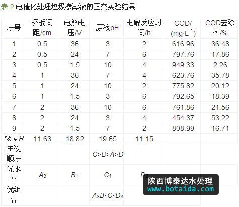 分析表 2發(fā)現(xiàn),原液pH對降解效果的影響最顯著,其次是電解電壓;各因素對電催化反應(yīng)的影響順序?yàn)椋涸簆H>電解電壓>極板間距>電催化氧化時(shí)間。