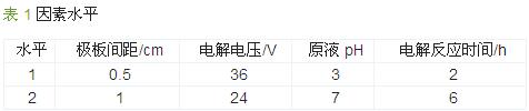 設(shè)計(jì)極板間距(A)、電解電壓(B)、原液pH(C)和電解反應(yīng)時(shí)間(D)4因素3水平L9 (34)正交實(shí)驗(yàn)表,如表 1所示,實(shí)驗(yàn)結(jié)果列于表 2。