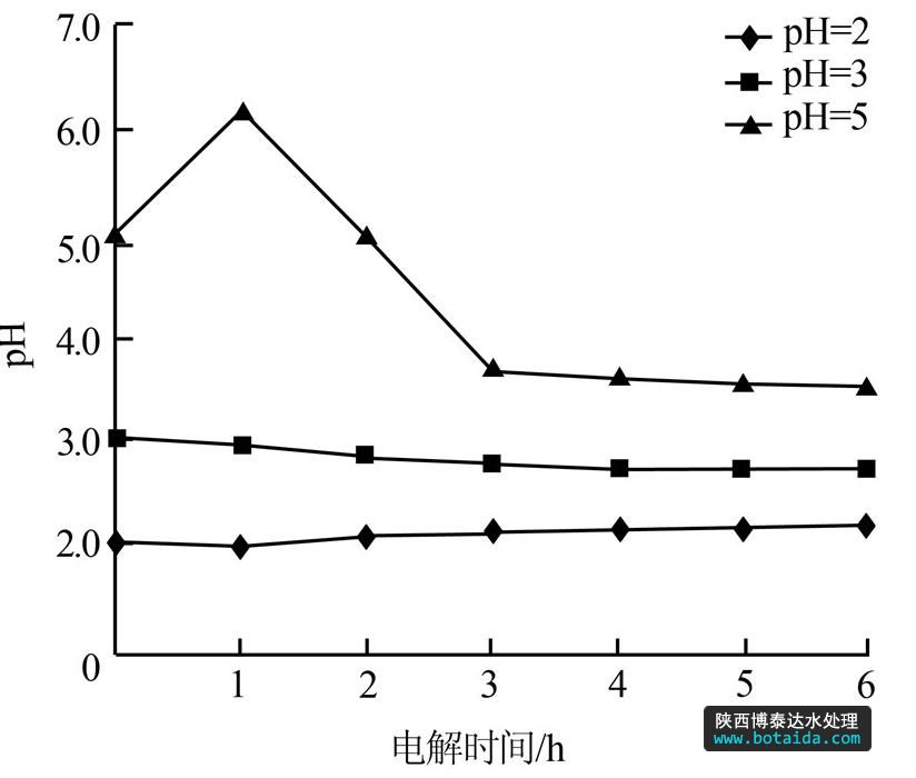 圖 3 初始pH為2、3、5時(shí)pH隨時(shí)間變化情況