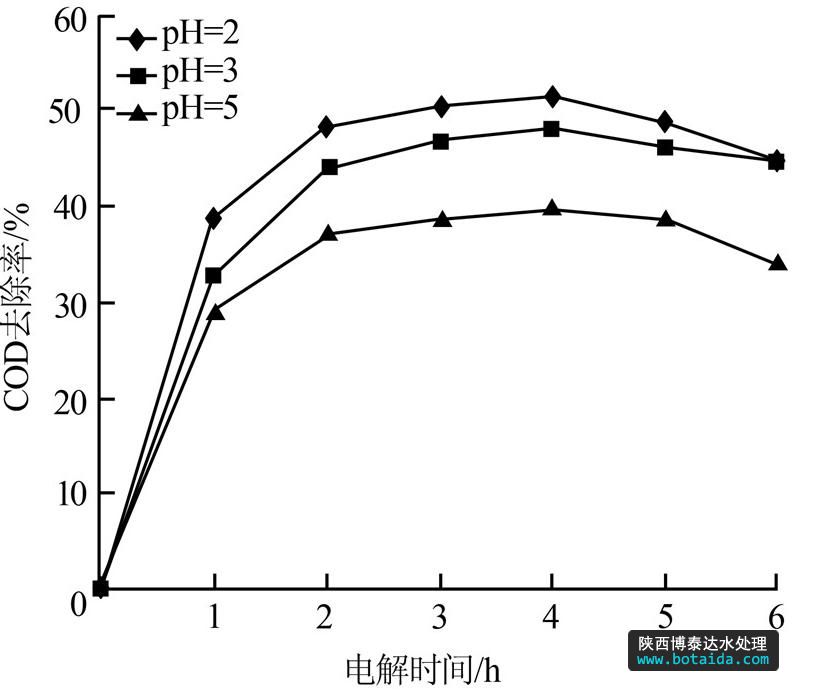 綜上不難發(fā)現(xiàn),當(dāng)滲濾液的pH分別為2、3、5 時(shí),隨電解時(shí)間的延長,COD去除率進(jìn)一步增加,但超過4 h后去除率基本不變;當(dāng)電解電壓為24、36 V,電解4 h時(shí),COD去除率達(dá)到最大;極板間距為1.5 cm時(shí),電解約4 h COD去除率也達(dá)到最大值。這說明采用Ir-Ta-Sn摻雜電極對垃圾滲濾液進(jìn)行電催化降解時(shí),電解時(shí)間不宜超過4 h,此時(shí)COD去除率已達(dá)到最大值;電解時(shí)間繼續(xù)延長,垃圾滲濾液中的COD不但不降低,反而會(huì)有一定程度的回升。因此合理控制電化學(xué)氧化時(shí)間,可以減少能耗,并提高COD去除率。