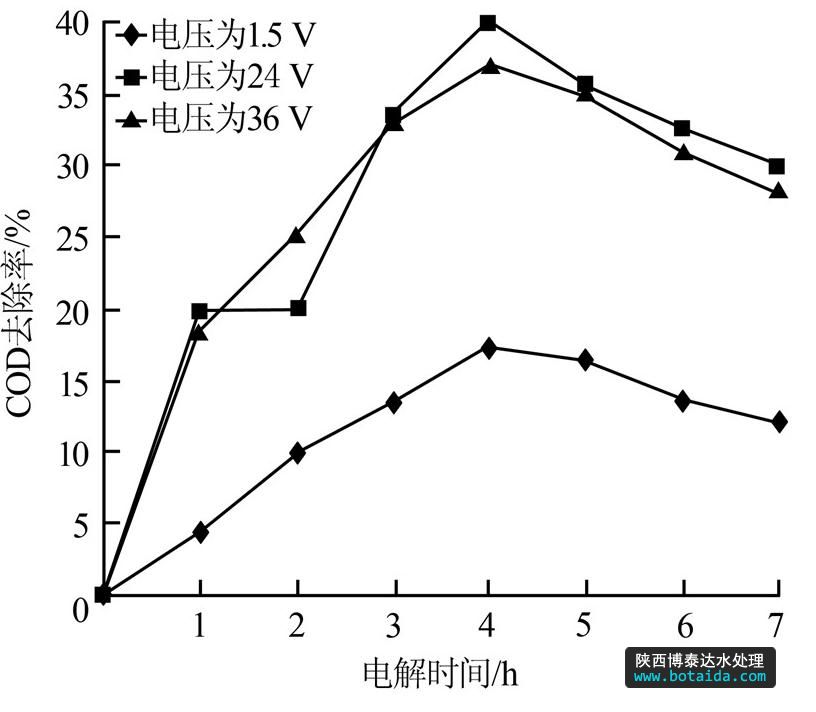 圖 4 外加電壓為1.5、24、36 V時(shí)COD去除率的變化