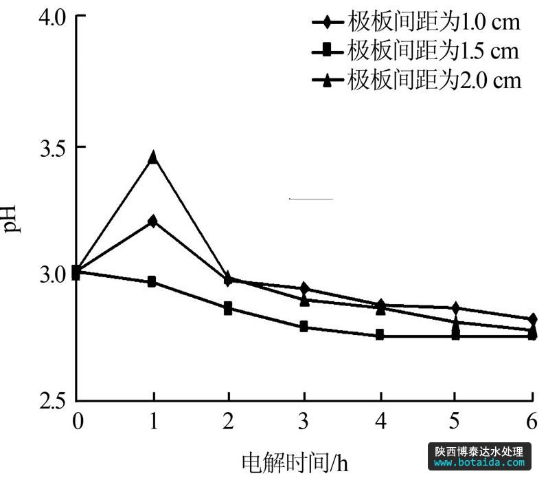 圖 6 不同極板間距下pH隨時(shí)間變化情況
