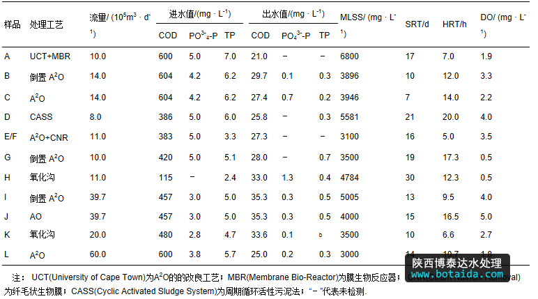 實(shí)驗(yàn)所用的污泥樣品分別采集于9個(gè)污水處理廠,其中有2個(gè)水廠各包含2個(gè)工藝,共11個(gè)工藝.每個(gè)工藝取1個(gè)污泥樣品.其中,針對(duì)A2O+纖毛狀生物膜(CNR)工藝取2個(gè)樣品,分別位于加膜區(qū)和無(wú)膜區(qū),是為了考察加膜對(duì)聚磷菌的菌群結(jié)構(gòu)是否有影響,因此,共有12個(gè)樣品.12個(gè)樣品依次命名為A、B、C、D、E、F、G、H、I、J、K和L.其中,B和C取自同一水廠,I和J取自同一水廠,E和F取自A2O+纖毛狀生物膜工藝的加膜區(qū)和無(wú)膜區(qū).污水處理廠的運(yùn)行參數(shù)及進(jìn)出水指標(biāo)見表 1.