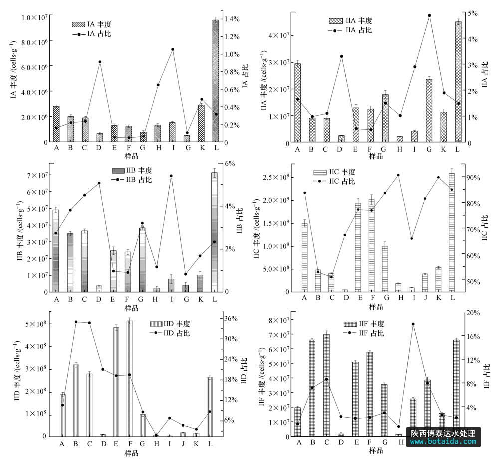 采用實(shí)時(shí)定量PCR定量分析Accumulibacter(I、IIA、IIB、IIC、IID、IIF)6個(gè)分支的豐度,結(jié)果如圖 1所示.Accumulibacter 6個(gè)分支均為單拷貝基因,即Accumulibacter的細(xì)胞數(shù)為ppk1基因的拷貝數(shù).總Accumulibacter的定量變化范圍為7.32×107(D)~3.05×109 cells · g-1(L),平均為1.20×109 cells · g-1(以MLSS計(jì)).在12個(gè)樣品中,只有D樣品數(shù)量級(jí)為107,比其他樣品低1~2個(gè)數(shù)量級(jí),其中的Accumulibacter ppk1基因含量偏低;有6個(gè)樣品數(shù)量級(jí)為108,分別為H、B、C、I、J和K;樣品A、E、G、F和L的數(shù)量級(jí)為109,這5個(gè)樣品中的Accumulibacter的ppk1基因含量高于其他樣品,其中樣品L(A2O工藝)含量最高,達(dá)到了3.05×109 cells · g-1(以MLSS計(jì)).12個(gè)樣品中Accumulibacter占總菌的百分比變化范圍為0.58%~ 22.77%,平均為9.17%(圖 1).