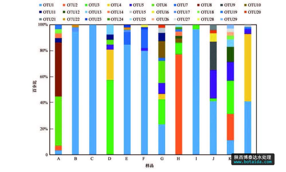 OTU1共出現(xiàn)12次,即每個(gè)樣品中都有序列出現(xiàn)在OTU1中,同時(shí)還是樣品B、C、E、F、F、I和J共6個(gè)克隆文庫(kù)中的優(yōu)勢(shì)OTUs.OTU3和OTU5在6個(gè)樣品中出現(xiàn),尤其在樣品H的克隆文庫(kù)中分布廣泛.OTU7出現(xiàn)了4次.有4個(gè)OTUs共出現(xiàn)3次,分別為OTU2、OTU4、OTU6和OTU11.上述8個(gè)OTUs為Accumulibacter的主要種屬.有10個(gè)OTUs(OTU10、OTU12、OTU13、OTU15、OTU17~ OTU20、OTU22、OTU23)出現(xiàn)2次,有11個(gè)(OTU9、OTU10、OTU14、OTU16、OTU21、OTU24~ OTU29)共出現(xiàn)1次,這21個(gè)OTUs中每個(gè)OTUs包含1~2條ppk1序列,不是Accumulibacter的主要種屬.
