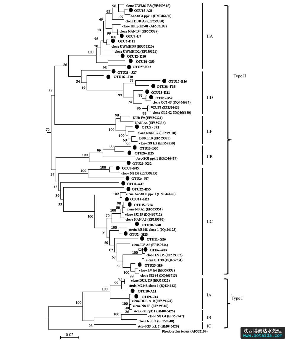 利用29個(gè)OTUs的代表序列建立的系統(tǒng)發(fā)育樹如圖 4所示.He等(2007)對(duì)9個(gè)市政污水處理廠中Accumulibacter的群落進(jìn)行分析認(rèn)為,實(shí)際污水處理廠污水組成和運(yùn)行情況比較復(fù)雜會(huì)導(dǎo)致污水中Accumulibacter種類比較豐富,所測(cè)得的序列至少分布在3個(gè)進(jìn)化枝中.Type I包括IA、IB、IC進(jìn)化枝,Type II包括IIA、IIB、IIC、IID、IIF進(jìn)化枝.ID、IE、IIE和IIG在淡水和河口沉積物中發(fā)現(xiàn),在此不做考慮.另外,序列Rhodocyclus tenuis 作為參考序列.以往的研究均是通過(guò)各個(gè)水廠中的代表序列建系統(tǒng)發(fā)育樹,但本研究中采用各OTUs中代表序列建立系統(tǒng)發(fā)育樹,這樣更方便從整體上觀察幾個(gè)工藝中Accumulibacter的分布情況.如圖 4所示,OTUs在幾個(gè)進(jìn)化枝間分布比較均勻,有27個(gè)OTUs屬于Type II型的Accumulibacter,僅有2個(gè)OTUs(共12條序列)屬于Type I型,說(shuō)明實(shí)際污水除磷系統(tǒng)中的Accumulibacter主要以Type II型為主,與QPCR結(jié)果一致.