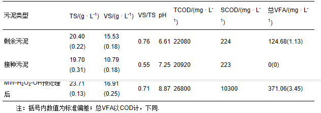 試驗(yàn)所用剩余污泥取自北京清河污水處理廠,取回后靜置濃縮,置于4 ℃保存.接種污泥取自北京小紅門污水處理廠,為中溫(35℃)厭氧消化出泥.試驗(yàn)前污泥過18目標(biāo)準(zhǔn)篩以除去大顆粒雜質(zhì).試驗(yàn)采用MW-H2O2-OH預(yù)處理工藝(Wang et al., 2015;Wang et al., 2009;Xiao et al., 2012;王亞煒,2009;肖慶聰?shù)龋?012;閻鴻,2010),其操作條件如下:加入5 mol · L-1 NaOH溶液,調(diào)節(jié)樣品pH至11,600 W微波功率輻射樣品,升溫至80 ℃,然后按m(H2O2)/m(TS)=0.2加入30%的過氧化氫溶液,繼續(xù)輻射升溫至100℃,結(jié)束.本試驗(yàn)通過微波-過氧化氫-堿預(yù)處理達(dá)到堿性環(huán)境,以抑制產(chǎn)甲烷過程.試驗(yàn)所用污泥的主要性質(zhì)見表 2.污泥經(jīng)過MW-H2O2-OH預(yù)處理后,添加100 mg · L-1過氧化氫酶(Sigma),混合完全攪拌一定時(shí)間以便將殘留過氧化氫分解完全,之后按照I/S(Inoculum to Substrate,揮發(fā)性固體濃度VS/VS)為0.07的比例進(jìn)行接種污泥接種.之后按照響應(yīng)面法安排進(jìn)行試驗(yàn),試驗(yàn)中采用的蛋白酶酶活為20萬U · g-1(江蘇銳陽生物科技有限公司).