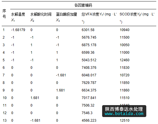 根據(jù)CCD(Central Composite Designs)中心組合試驗(yàn)設(shè)計(jì)原理,在前期單因素試驗(yàn)的基礎(chǔ)上,選擇水解溫度、水解酸化時(shí)間和蛋白酶投加量作為自變量,分別用X1、X2、X3表示,以總VFA濃度和SCOD濃度作為響應(yīng)值,分別用Y1、Y2表示,進(jìn)行響應(yīng)面試驗(yàn)因素水平安排,具體見表 1.由Design Expert 8.0.6(Stat-Ease),采用CCD試驗(yàn)設(shè)計(jì)原理,得到3因素3水平共20個(gè)試驗(yàn)點(diǎn)的試驗(yàn)方案,并對(duì)試驗(yàn)數(shù)據(jù)進(jìn)行二次多元回歸擬合.二次多元回歸方程為: