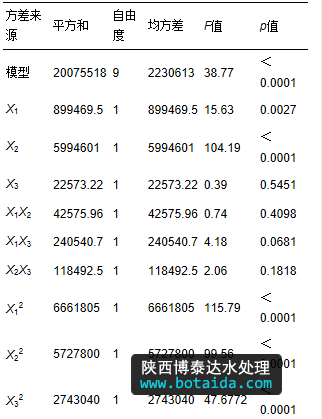 同樣地,經(jīng)二次多元回歸擬合和方差分析后,得到各單因素、交互項(xiàng)及平方項(xiàng)對(duì)SCOD濃度的影響情況,相應(yīng)的回歸方程(4)為: