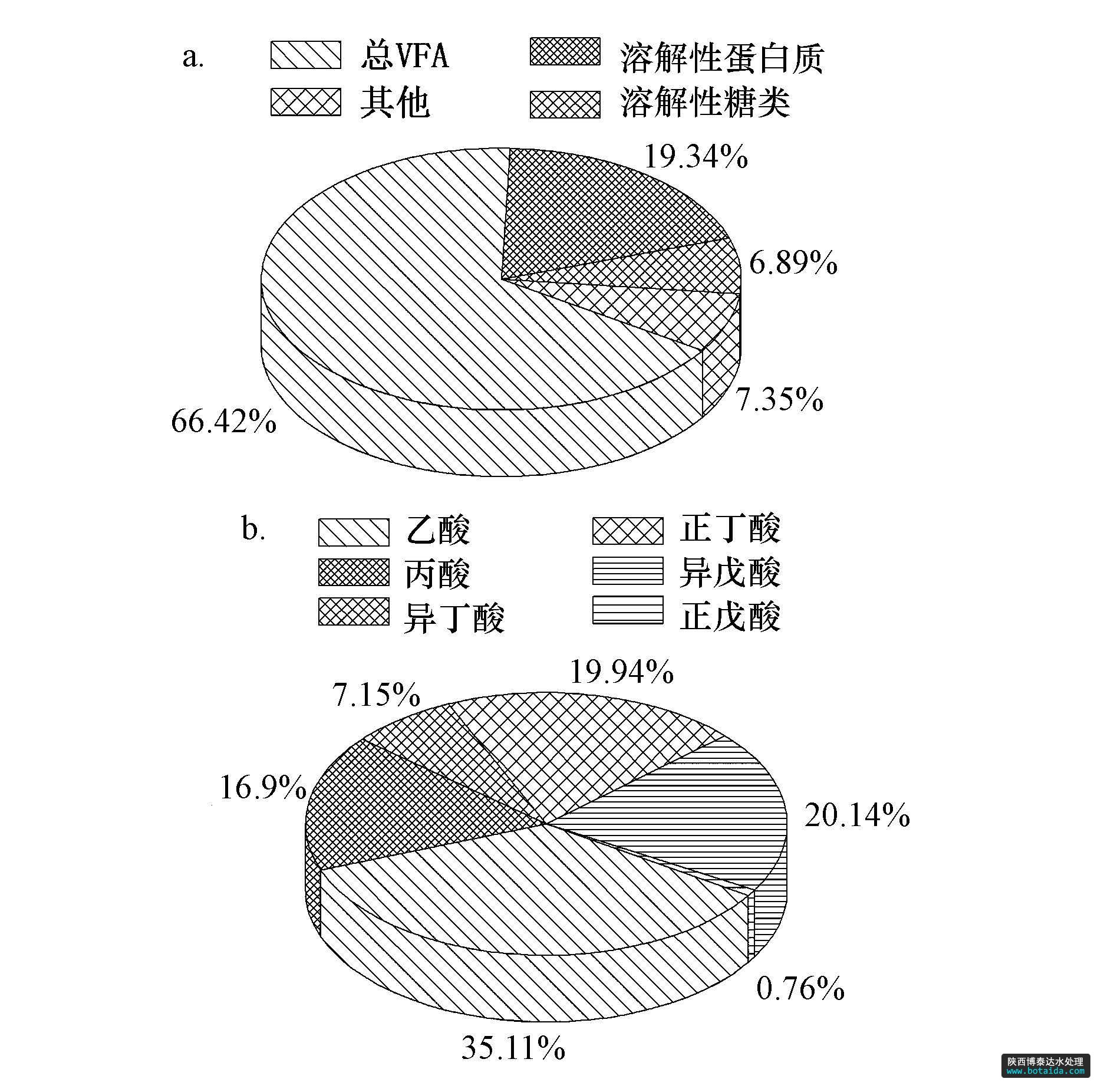 如圖 3所示,在碳源組成方面,優(yōu)化工藝條件下SCOD占TCOD的44.56%,總VFA占SCOD的66.42%,溶解性蛋白質(zhì)占SCOD的19.34%,溶解性糖類占SCOD的6.89%,其他類物質(zhì)占SCOD的7.35%.在VFA組成方面,乙酸占總VFA的35.11%,丙酸占總VFA的16.90%,異丁酸占總VFA的7.15%,正丁酸占總VFA的19.94%,異戊酸占總VFA的20.14%,正戊酸占總VFA的0.76%.碳源以總VFA為主,其中,VFA以乙酸、異戊酸、正丁酸、丙酸為主.