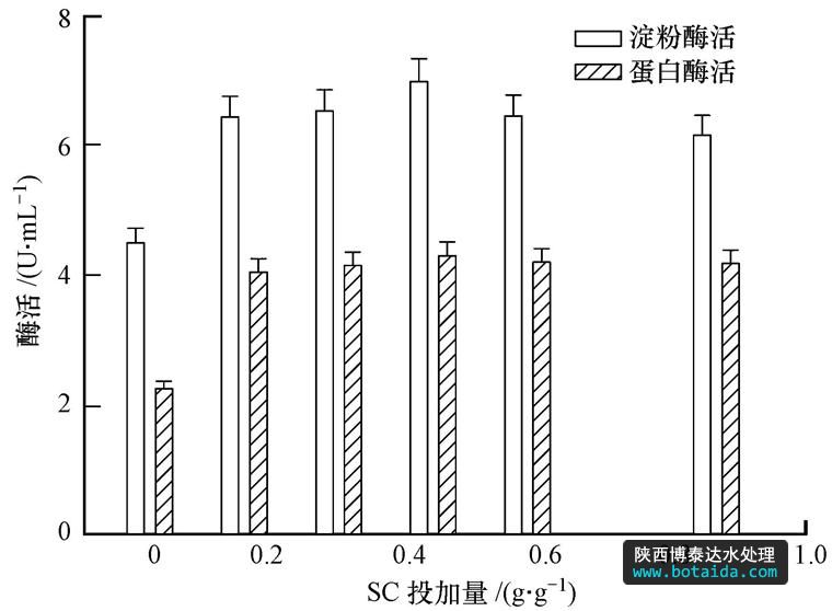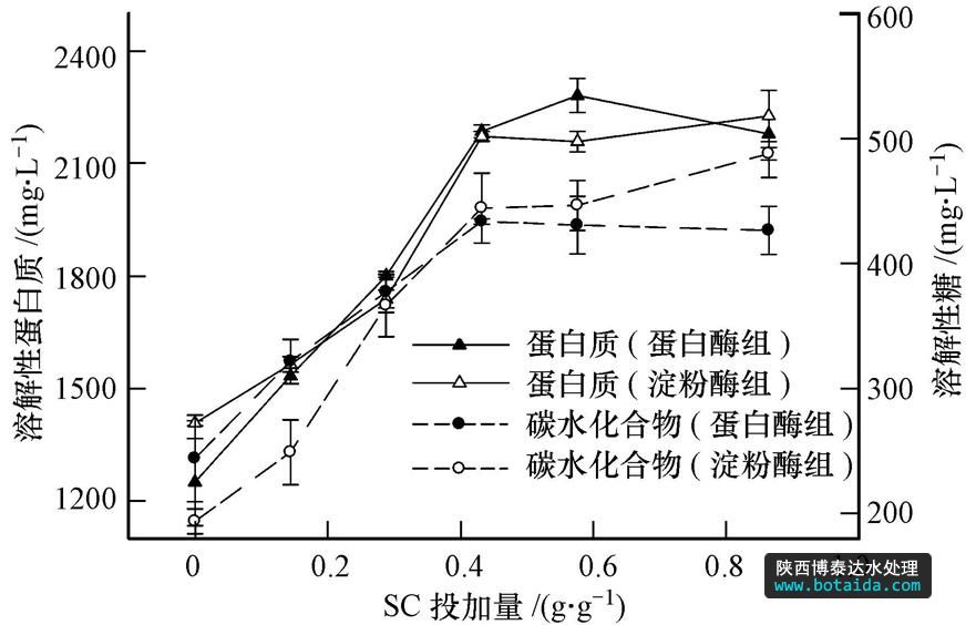 SC對污泥酶水解影響:設(shè)立2批次實驗(每批次包括6個實驗組),各批次均取400 mL污泥,分別投加蛋白酶、淀粉酶0.06 g · g-1(以TS 計,下同),SC以粉末形式投加,SC的投加量分別為0、0.144、0.288、0.432、0.576、0.864 g · g-1,隨后向各錐形瓶中通入氮氣約4 min以完全驅(qū)除殘留空氣,加塞置于50℃水浴振蕩器上反應(yīng),4 h后取樣測定水解產(chǎn)物及蛋白酶和淀粉酶的活性,并進行分析.同時設(shè)定空白對照組,除不加酶和SC外,其它條件與實驗組均相同.