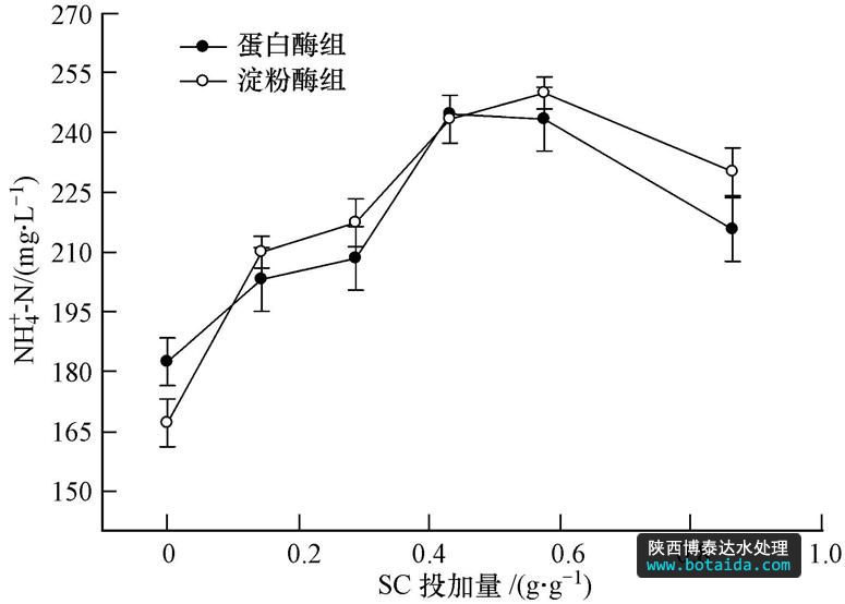 圖 3為反應(yīng)4 h后,污泥中氨氮濃度隨SC投加量的變化情況.在水解酶的催化作用下,污泥中的含氮物質(zhì)——主要為蛋白質(zhì)轉(zhuǎn)化為二肽、氨基酸,氨基酸進一步轉(zhuǎn)化為氨(Shanableh et al., .,2001).因此,蛋白質(zhì)不斷溶出的同時,污泥液相中的氨氮濃度也不斷提高.只投加水解酶(不投加SC)時,氨氮濃度由原污泥的60.0 mg · L-1分別增加至182.0 mg · L-1(蛋白酶組)和167.0 mg · L-1(淀粉酶組).當(dāng)SC投加量為0.432 g · g-1時,氨氮濃度分別增加至245.0 mg · L-1(蛋白酶組)和243.0 mg · L-1(淀粉酶組).蛋白質(zhì)和碳水化合物是剩余污泥的主要組成成分,脂肪含量很少,基本可以忽略.蛋白質(zhì)的可生化降解性較差,其水解在污泥消化過程中是限速步驟,決定了此過程中有機物的降解程度(劉常青等,2008).SC的投加提高了蛋白質(zhì)的降解速率,一方面是由于SC的投加促使更多的蛋白質(zhì)溶解到液相,其降解速率高于固相中的蛋白質(zhì).另一方面,SC的投加破壞了EPS的網(wǎng)絡(luò)結(jié)構(gòu),水解酶得到釋放,從而增加了其與底物的接觸機會,蛋白質(zhì)的轉(zhuǎn)化效率得到提高.