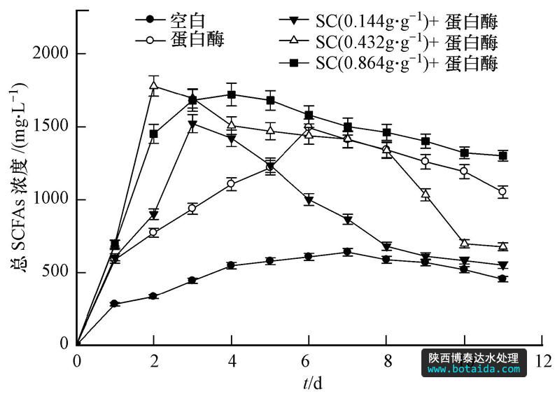 SC對污泥產(chǎn)酸影響:設(shè)立4組實驗,各組均取400 mL污泥,先投加蛋白酶0.06 g · g-1,SC以粉末形式投加,每組SC的投加量分別為0、0.144、0.432、0.864 g · g-1,隨后向各錐形瓶中通入氮氣約4 min以完全驅(qū)除殘留空氣,加塞置于50℃水浴振蕩器上反應(yīng),反應(yīng)裝置在此條件下反應(yīng)12 d,每天對酸化產(chǎn)物SCFAs進行測定.同時設(shè)定空白對照組,除不加酶和SC外,其它條件與實驗組均相同.