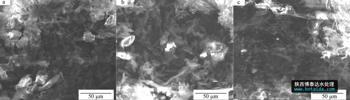圖 5 污泥經(jīng)不同處理后的SEM圖 (a.原污泥;b.蛋白酶;c. SC+蛋白酶)
