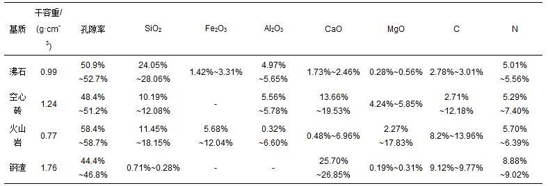 沸石、火山巖購(gòu)于北京某濾料廠,沸石粒徑2~5 mm,火山巖粒徑2~10 mm.空心磚來自北京某工地,鋼渣來自南昌某鋼廠,研磨過篩后粒徑為2~5 mm.各填料均用清水清洗,并烘干備用.填料干容重與孔隙率采用標(biāo)準(zhǔn)土壤學(xué)方法測(cè)定.填料的化學(xué)組成采用X射線能譜儀測(cè)定(EX-250,HORIBA公司,日本).4種填料的理化性質(zhì)如表 1所示.