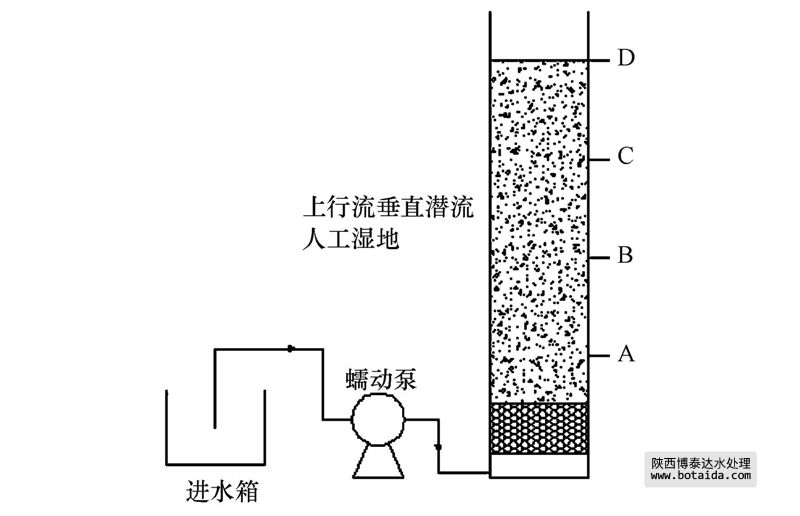 試驗(yàn)裝置模擬上行流垂直潛流人工濕地,裝置直徑15 cm,高100 cm,填料層高度80 cm,底部填充10 cm厚的礫石為布水區(qū)(圖 1).填料柱采用蠕動(dòng)泵進(jìn)水,進(jìn)水以松花江富錦段微污染江水水質(zhì)為依據(jù)配水,水質(zhì)為COD 80~100 mg · L-1,NH+4-N 10~13 mg · L-1,NO-3-N 13~15 mg · L-1,TP 1.5~2.5 mg · L-1.水力負(fù)荷為2.65 mL · min-1,運(yùn)行時(shí)間為20周.系統(tǒng)穩(wěn)定運(yùn)行后,對(duì)填料層的不同深度進(jìn)行分析,考察不同填料段污染物在濕地中去除的規(guī)律,在填料20、40、60、80 cm處分別設(shè)置取樣口,編號(hào)分別為A(0~20 cm)、B(20~40 cm)、C(40~60 cm)、D(60~80 cm).