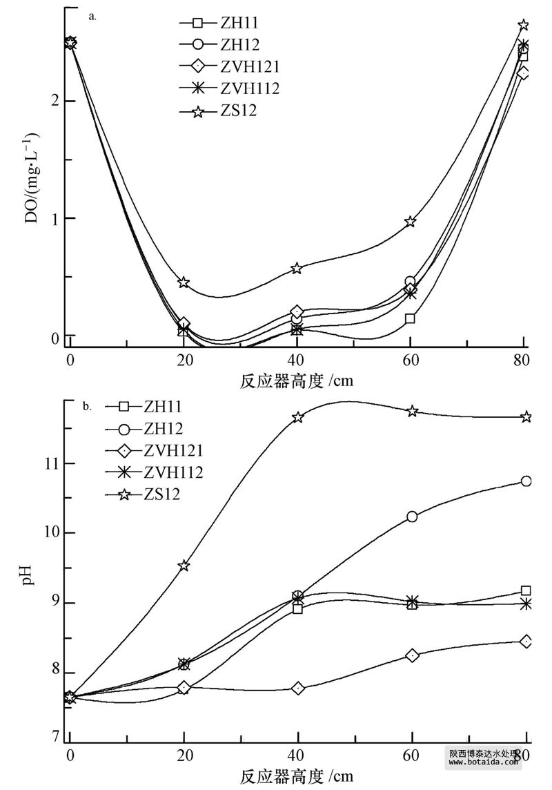 圖 2 DO和pH隨反應(yīng)器高度的變化