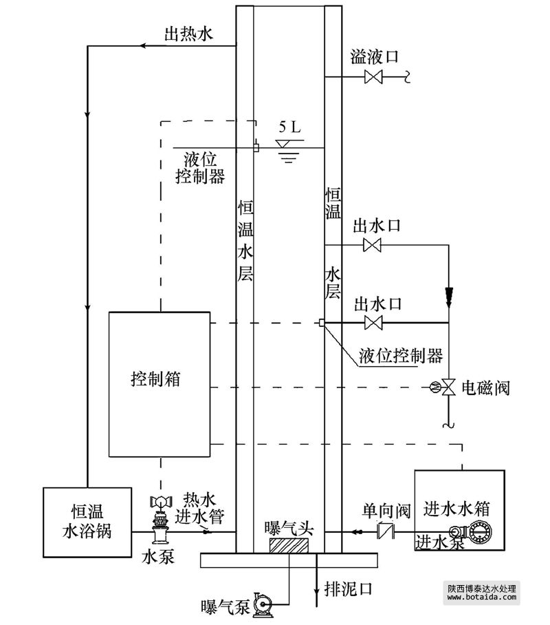 反應(yīng)器有效容積5 L,內(nèi)徑為100 mm,總高850 mm(圖 1).SBR運(yùn)行參數(shù):自控裝置控制運(yùn)行周期,處理水量為2.5 L · 周期-1,每周期6 h,包括進(jìn)水5 min,曝氣240 min,靜沉75 min,排水10 min,靜置30 min;溫度(25.0±0.5)℃.進(jìn)水水箱中設(shè)有循環(huán)泵,確保進(jìn)水成份均勻.曝氣時(shí)控制反應(yīng)器內(nèi)DO≥2 mg · L-1.實(shí)驗(yàn)過(guò)程中平均1天排1次泥,保證MLSS為5000 mg · L-1左右,污泥齡約為6 d.