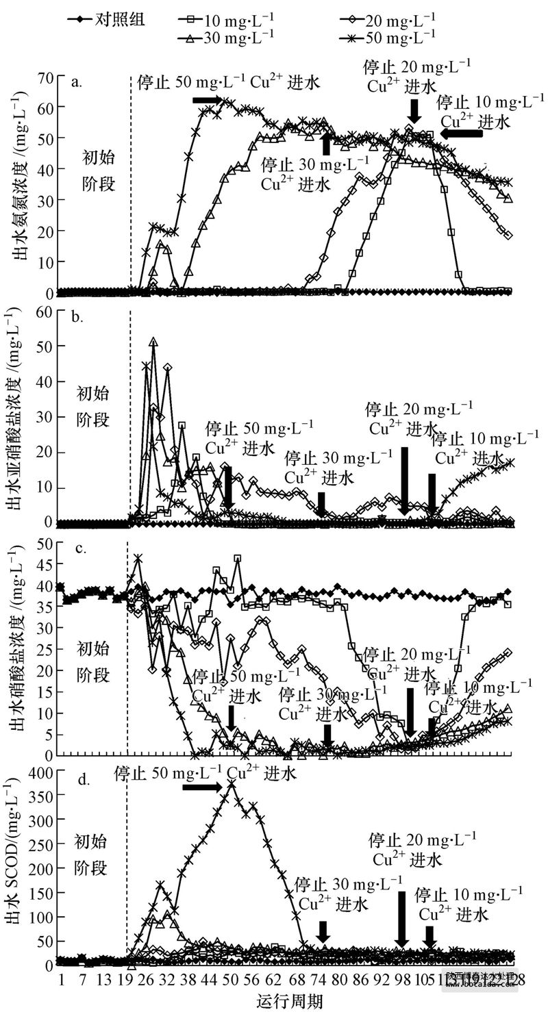 試驗(yàn)采用5個(gè)相同的SBR反應(yīng)器進(jìn)行持續(xù)負(fù)荷試驗(yàn).其中1個(gè)反應(yīng)器為對(duì)照體系,進(jìn)水始終為不含Cu2+的模擬污水.另外4個(gè)反應(yīng)器在第1~20周期內(nèi)的進(jìn)水為不含Cu2+的模擬污水,該階段為初始階段;第21周期后,4個(gè)反應(yīng)器的進(jìn)水變?yōu)楹珻u2+濃度分別為10、20、30和50 mg · L-1的模擬污水,該階段為抑制階段;當(dāng)各反應(yīng)器的出水NH+4-N保持穩(wěn)定后,停止向進(jìn)水中加Cu2+,系統(tǒng)進(jìn)入恢復(fù)階段.