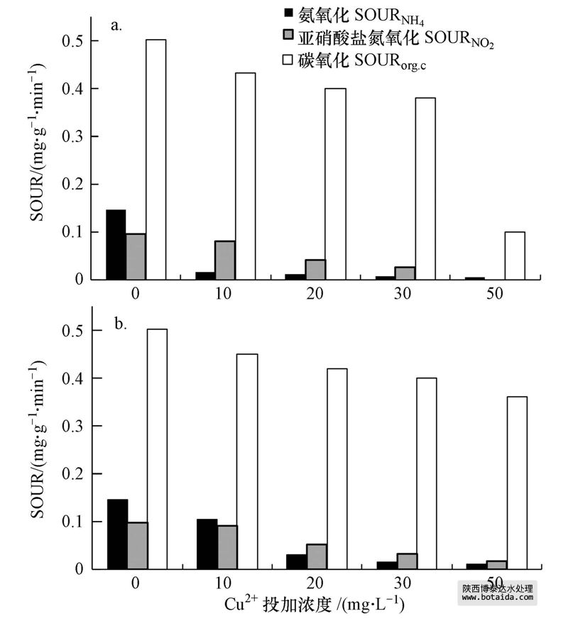 2)Cu2+對(duì)硝化細(xì)菌的活性抑制作用明顯.在抑制期,Cu2+濃度為10~50 mg · L-1時(shí),AOB活性抑制率為89.1%~95.5%,NOB抑制率為16.4%~94.9%,異養(yǎng)菌抑制率為13.8%~80.0%.各體系中Cu2+對(duì)菌群的抑制率為:AOB>NOB>異養(yǎng)菌.
