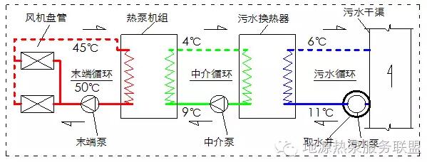 為應(yīng)對污水或地表水水質(zhì)條件,目前的系統(tǒng)多采用間接式系統(tǒng)。先將污水或地表水的熱量傳遞給清潔水,再由清潔水進(jìn)入熱泵機組,清潔水在污水換熱器和熱泵機組之間形成封閉循環(huán),起中介熱量傳遞作用,我們將其稱之為“中介循環(huán)”,而污水或地表水的自身循環(huán)稱之為“污水或地表水循環(huán)”,末端系統(tǒng)循環(huán)水在熱泵機組與末端散熱設(shè)備之間循環(huán)則稱之為“末端循環(huán)”。
