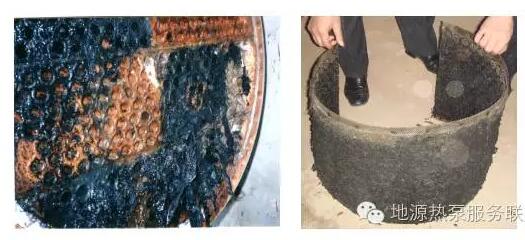 (1)防堵塞。未處理原生污水中含有大尺度懸浮物,包括纖維狀的發(fā)絲類、紙屑類、藻狀類,普通的換熱設(shè)備是根本無法承受的。而實踐證明:已處理污水和地表水中的懸浮物含量相對較少,盡管與未處理原水不在同一數(shù)量級,但隨著運行時間增長,堵塞問題也立即突現(xiàn),原水的堵塞時間為1~3d,而地表水則為7~10d。圖4是未處理原生污水的堵塞現(xiàn)象,圖5是已處理污水的堵塞狀況。