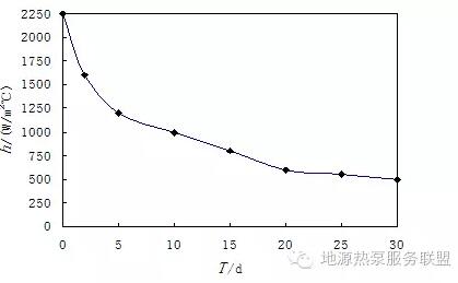 已處理污水與地表水(江河湖海水)屬同類,與未處理原水相比,相對清潔,但水源的利用為開式循環(huán),小時流量數(shù)百至上千立方米,污染成迅速的累積過程,易“短時污染”(7~10d),因此對熱泵系統(tǒng)或換熱過程也是“非清潔”的水源。圖6是某地表水源熱泵工程換熱器熱熱量衰減幅度圖。