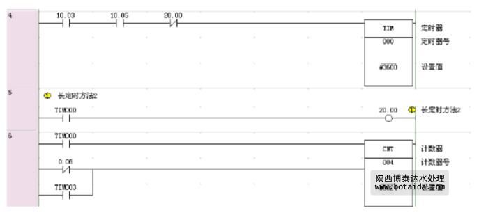 水處理系統(tǒng)所要達(dá)到的結(jié)果,這一段時(shí)間實(shí)現(xiàn)后,下面要實(shí)現(xiàn)的就是長(zhǎng)定時(shí)的方法2,設(shè)置常開(kāi)點(diǎn)TIM000,在常開(kāi)點(diǎn)TIM000后接上線圈2000,這一小段程序雖然在整個(gè)污