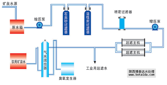 礦泉水源→原水箱→原水增壓泵→石英砂過濾器→活性炭過濾器→精密過濾器→高壓泵→超濾主機→工業(yè)用超濾水→臭氧發(fā)生器→氣水混合器→飲用礦泉水如需要產(chǎn)品及技術(shù)服務(wù),請撥打服務(wù)熱線:13659219533