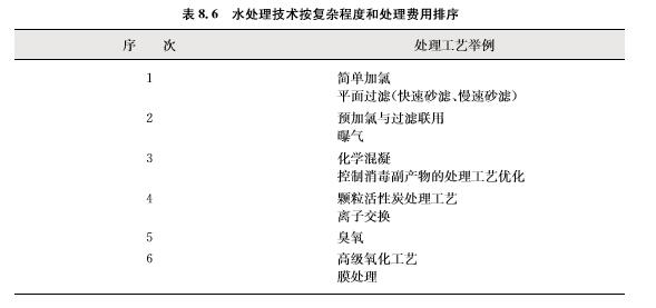 ? 不同水處理工藝按其復(fù)雜程度和處理費(fèi)用的定性排序如表8.6所示,次序越高,工藝或 運(yùn)營(yíng)越復(fù)雜。