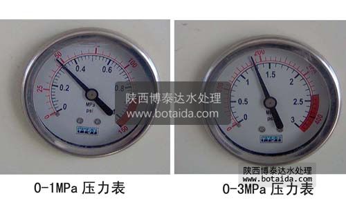 4 、壓力表:測(cè)量系統(tǒng)進(jìn)水壓力、段間壓力、濃水壓力、產(chǎn)水壓力。