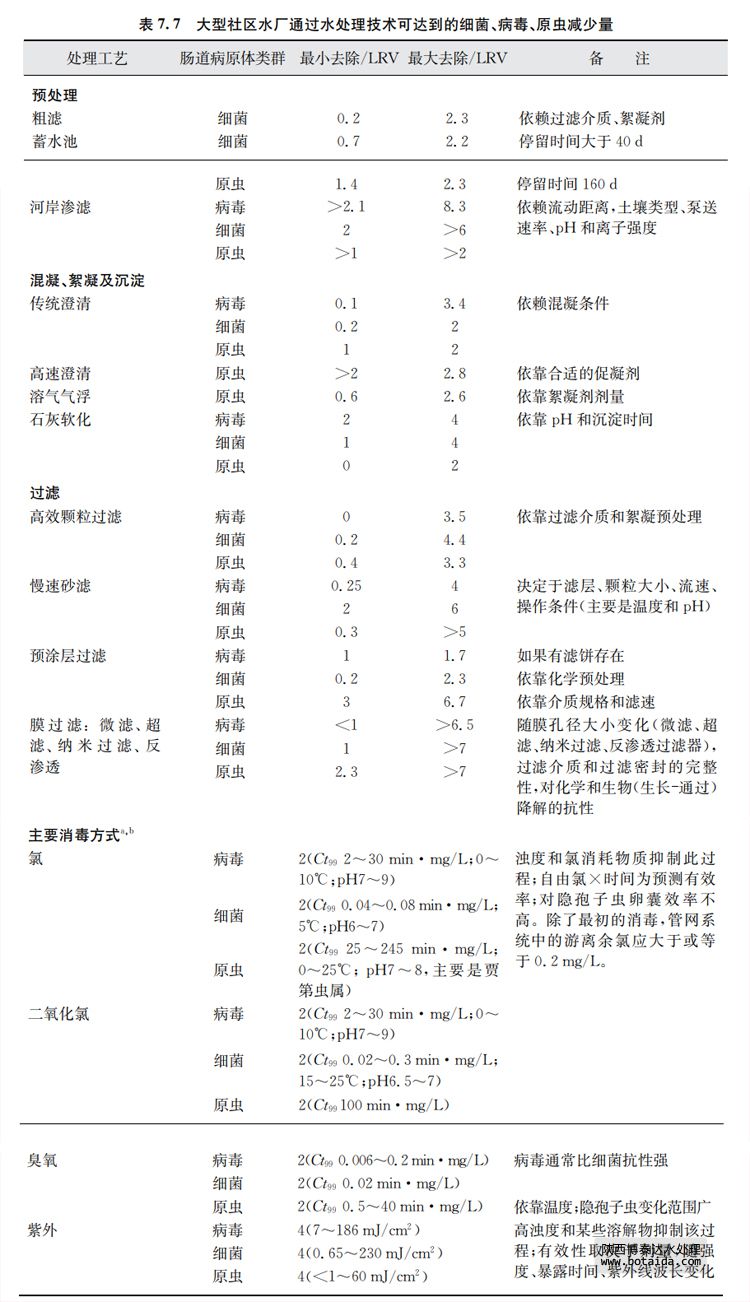 表7.7中列出的微生物降低水平是指微生物的大類群或類別:細(xì)菌、病毒和原蟲。由 于各種微生物本身所固有的特性(如大小、外保護(hù)層特性和表面理化性質(zhì)等)不同,因而不同 種類的微生物的處理效果往往存在差異。在這些微生物類群中,處理效果在特定的種、型、 株間差別較小。但這種差別確實(shí)存在,表中針對各類群微生物中抵抗力強(qiáng)、存活時間久的病 原體列出了去除的保守估計。若某一微生物類群中不同的病原體在處理后下降值差別較大 時,則在表中單獨(dú)列出針對相應(yīng)病原體的處理結(jié)果。