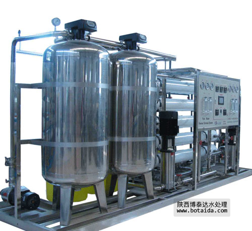 原水→原水加壓泵→多介質(zhì)過濾器→活性炭過濾器→軟水器→精密過濾器→第一級反滲透 →PH調(diào)節(jié)→中間水箱→第二級反滲透(反滲透膜表面帶正電荷)→純化水箱→純水泵→微孔過濾器→用水點