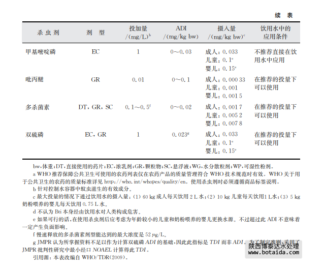 雖然沒必要為以控制攜菌體為目的的農(nóng)藥設(shè)定準則值,但有必要就它們使用時的安全 性提供足夠的信息。用于飲用水攜菌體控制的農(nóng)藥劑型必須嚴格遵守商品標簽建議,并且 包括從材料到配制最終產(chǎn)品的配方組分,一定要使用國家主管部門批準可用于此用途的產(chǎn) 品。為制定準則評估控制攜菌體的農(nóng)藥時,評價報告主要由犃犇犐與潛在暴露風險的比較組 成。不過,超過犃犇犐的攝入不一定意味著會對健康產(chǎn)生負面影響。由于攜菌體傳播的疾病 有很高的發(fā)病率和死亡率,控制病原昆蟲與飲用水攝入農(nóng)藥量之間必須找到一個合適的平 衡。需要強調(diào)的是,應(yīng)努力使總攝入量和任何殺幼蟲劑的濃度都低于 WHOPES的推薦水 平,并且在具有足夠的效力條件下盡可能低。