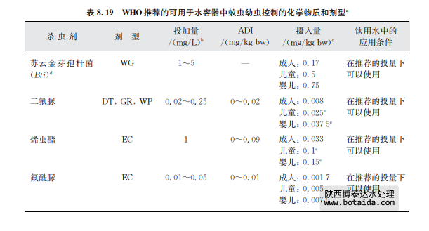 WHOPES對因公共衛(wèi)生目的使用的農(nóng)藥進行了評價。目前,WHOPES已評估并列出的 可在容器中控制蚊蟲幼卵的包括七種殺幼蟲劑(二氟脲、烯蟲酯、氟酰脲、甲基嘧啶磷、吡丙醚、 多殺菌素和雙硫磷)和一種細菌殺蟲劑(蘇云金芽孢桿菌,犅犪犮犻犾犾狌狊狋犺狌狉犻狀犵犻犲狀狊犻狊犻狊狉犪犲犾犲狀狊犻狊)。