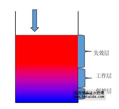 當(dāng)水流首先接觸的上層交換劑失效后,繼續(xù)進(jìn)入的原水就與下一層交換劑進(jìn)行離子交換,從而使工作層不斷下移。整個交換劑層便分為三個區(qū)域。隨著交換劑的運(yùn)行,失效層的區(qū)域不斷增大,工作層不斷下移,未交換區(qū)域隨之減少。