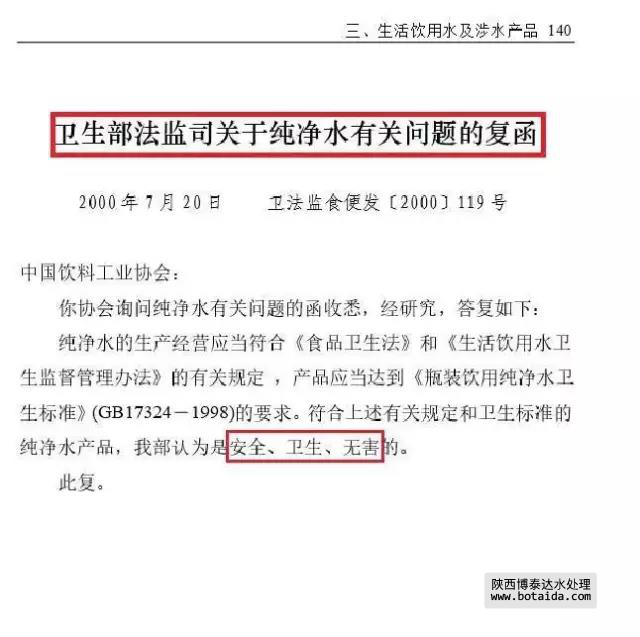 2000年7月20日,衛(wèi)生部衛(wèi)生法制與監(jiān)督司在給中國飲料工業(yè)協(xié)會的復函中說,純凈水“是安全,衛(wèi)生,無害的”。