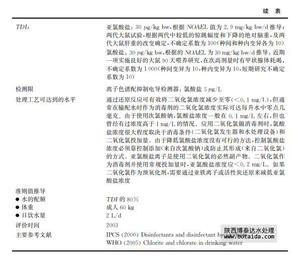 二氧化氯已被證明在試驗(yàn)小鼠圍產(chǎn)期會損害其神經(jīng)行為和神經(jīng)發(fā)育。在飲用水研究 中,接觸二氧化氯的老鼠和猴子也已觀察到會伴有甲狀腺激素顯著抑制的現(xiàn)象。尚未確定 二氧化氯的暫行準(zhǔn)則值,因?yàn)樗杆偎鉃閬喡人猁},而亞氯酸鹽的暫行準(zhǔn)則值能夠充分防 止二氧化氯的潛在毒性。該化合物的味覺閾值和嗅覺閾值是0.4mg/L。