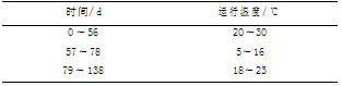 反應(yīng)器每天運(yùn)行 4 個周期,每個周期 6 h,分為: 進(jìn)水 10 min,厭氧 80 min,好氧 210 min,沉淀 ( 30 ~ 3) min( 沉淀時間在顆粒培養(yǎng)階段逐漸由 30min 遞減至 3 min,顆粒成熟之后保持 3 min) ,排水 10 min,剩余時間閑置,反應(yīng)器換水比為 75% . 運(yùn)行過程中對 pH 不做控制,控制曝氣流量為 1. 50L·min - 1 ,運(yùn)行溫度變化如表 1 所示.