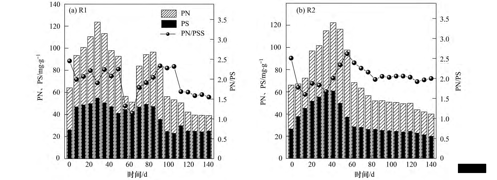 胞外聚合物( EPS) 主要由蛋白質(zhì)( PN) 和多糖 ( PS) 組成,在污泥顆?;^程中具有重要作 用. 如圖4 所示,PN、PS 在顆粒污泥啟動階段 ( 0 ~ 25 d 和 0 ~ 42 d) 整體呈上升趨勢,R1、R2 內(nèi)的 PN 含量( 以 MLSS 計) 分別由初始的 64. 12mg·g - 1 、65. 98 mg·g - 1 增 加 到 最 大 值 123. 65mg·g - 1 、122. 19 mg·g - 1 ,PS 含量分別由初始的26. 08 mg·g - 1 、26. 59 mg·g - 1 增加到最大值 64. 89mg·g - 1 、62. 13 mg·g - 1 . PS 越高,污泥表面親水性越強(qiáng),PN 增加,污泥疏水性增強(qiáng),細(xì)菌之間的黏附性能也隨之增加,有利于顆粒污泥的形成. R1 中微生物可利用的有機(jī)負(fù)荷較高,刺激微生物產(chǎn)生更多的EPS,故顆粒形成時間較短. 在實(shí)驗(yàn)進(jìn)行的第 57 ~ 78 d,由于室內(nèi)溫度較低( 5 ~ 16℃ ) ,R1 中PN 含量減少至 51. 15 mg·g - 1 ,細(xì)胞表面的疏水性減弱,不利于微生物相互黏附,顆粒解體,而生活污水中含有一定的蛋白質(zhì),與顆粒污泥接觸時可被絮凝吸附,故 R2 中PN 含量受溫度影響較小.