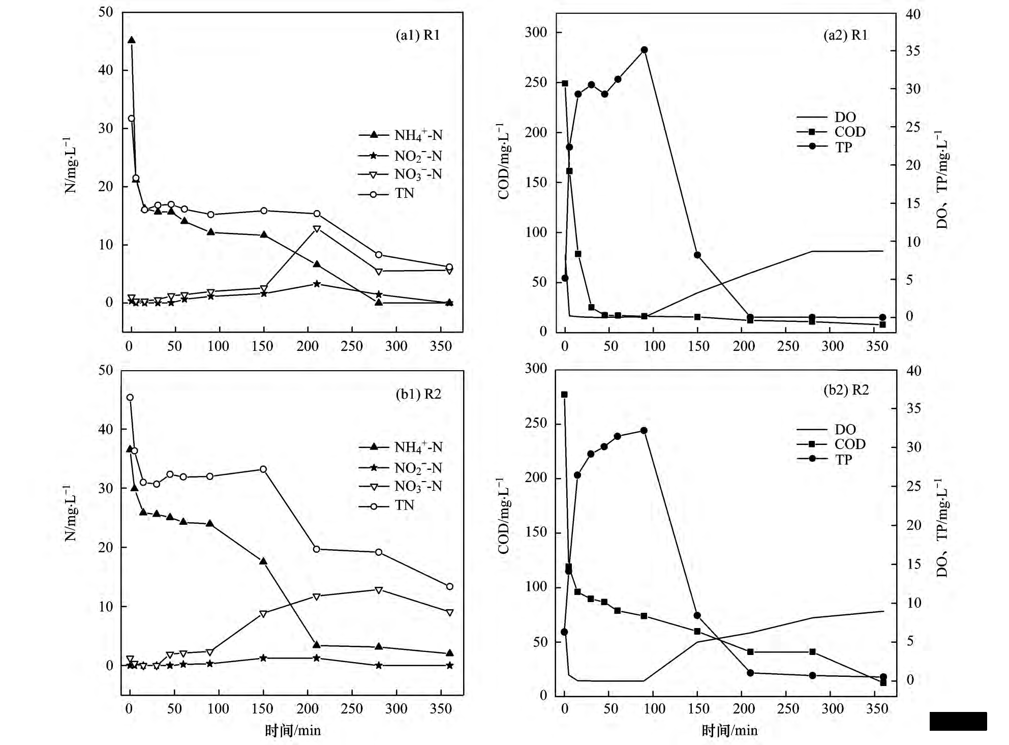 圖 6 為 R1、R2 在第 128 d 的一個典型周期內(nèi)NH + -N、NO - -N、NO - -N、TN、COD、TP、溶解氧4 2 3( DO) 的濃度變化. 厭氧階段,R1、R2 反應(yīng)器內(nèi)的DO 濃度在 0. 02 mg·L - 1 以下,好氧階段,R1、R2中 DO 緩慢增加,最終穩(wěn)定在 8 mg·L - 1 左右,反應(yīng)器內(nèi)具有良好的 A/ O 運(yùn)行環(huán)境. R1 中 COD 濃度在厭氧階段下降較快,在前 30 min 已經(jīng)基本消耗,COD 由 250 mg·L - 1 降至 25. 12 mg·L - 1 . R2 反應(yīng)器進(jìn)水為生活污水,在厭氧階段,由于有機(jī)物成分復(fù)雜,微生物可快速利用的有機(jī)碳源較少,所以降解速度較慢, COD 由 275. 19 mg·L - 1 降至 90. 44mg·L - 1 ; 在好氧階段,反硝化作用消耗有機(jī)碳源,COD 濃度逐漸降低至 24. 58 mg·L - 1 ,COD 得到去除. 在厭氧末期,R1 釋磷較多,反應(yīng)器內(nèi)的 TP 濃度為 35. 09 mg·L - 1 ,而 R2 反應(yīng)器內(nèi)的 TP 濃度為32. 18 mg·L - 1 . 導(dǎo)致釋磷量不同的主要原因?yàn)樯钗鬯泻新偕锝到馕镔|(zhì)和溶解性惰性物質(zhì)等不利于聚磷菌利用的有機(jī)物,在厭氧階段不能夠完全降解,降低了釋磷量. 在周期實(shí)驗(yàn)出水中,R1、R2 出水均未檢測到NH + -N、NO - -N,出水NO - -N濃度分別為 5. 65 mg·L - 1 、9. 67 mg·L - 1 ,產(chǎn)生這種現(xiàn)象的原因?yàn)?,穩(wěn)定運(yùn)行時,R1 中顆粒污泥粒徑較R2 大,由于好氧顆粒污泥內(nèi)部存在一個“缺氧區(qū)”,粒徑越大,顆粒污泥內(nèi)部的缺氧區(qū)越大,這為反硝化菌提供了良好的生存環(huán)境,提高了反硝化能力,因此 R1 反應(yīng)器內(nèi)NO - -N的出水效果更好.