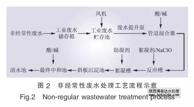 非經常性廢水處理系統(tǒng)工藝流程如圖2所示, 調整pH值后的廢水先后經過反應槽、絮凝槽完成凝聚、絮凝反應, 然后進入斜板沉淀池完成絮凝體與水的分離。沉淀池上部的清水自流進入最終中和池進行pH值調整, 最終出水流入清水池, 與經常性廢水匯總。