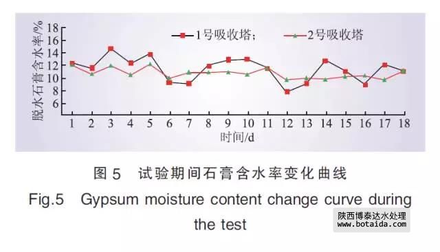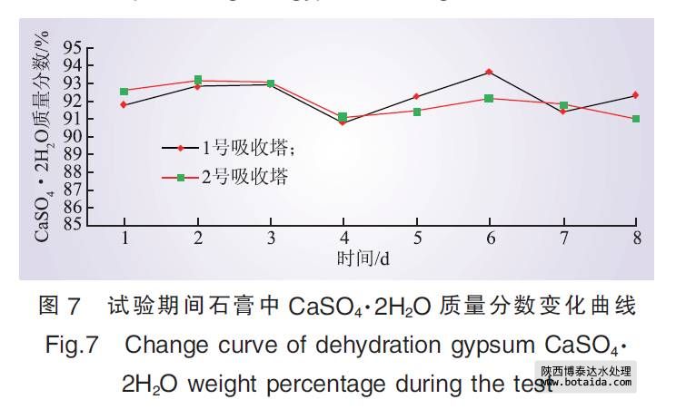 由圖3—7可以看出, 試驗期間, 雖然混入處理后的工業(yè)廢水量不斷加大, 但脫硫系統(tǒng)漿液密度均能維持在1 130 kg/m3左右, 且脫硫效率仍然大于或等于95%; 脫硫副產品石膏品質未發(fā)生明顯變化, 石膏的含水率基本保持在10%, 石膏中CaCO3質量分數(shù)小于3%, CaSO4· 2H2O純度大于90%, 符合商用石膏品質要求。此外, 試驗期間除霧器壓差處于正常運行范圍之內, 吸收塔沒有發(fā)生起泡、堵塞等不正?,F(xiàn)象。試驗結果表明, 處理后的工業(yè)廢水可用作脫硫工藝水。