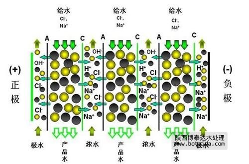 帶負電荷的陰離子(例如OH-、Cl-)被正極(+)吸引而通過陰離子交換膜,進入到鄰近的濃水室。此后這些離子在繼續(xù)向正極遷移中遇到鄰近的陽離子交換膜,而陽離子交換膜不允許陰離子通過,這些離子即被阻隔在濃水中。淡水流中的陽離子(例如Na+ 、H+)以類似的方式被阻隔在濃水室。在濃水室,透過陰陽膜的離子維持電中性。